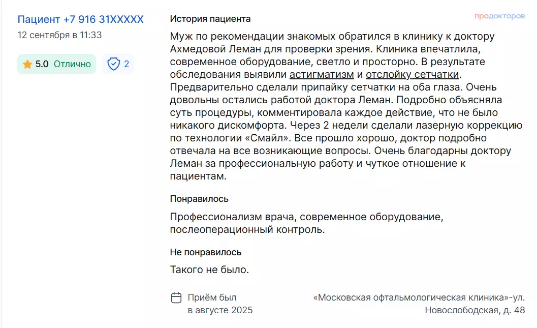 Муж по рекомендации знакомых обратился в клинику к доктору Ахмедовой Леман для проверки зрения. Клиника впечатлила, современное оборудование, светло и просторно. В результате обследования выявили астигматизм и отслойку сетчатки. Предварительно сделали припайку сетчатки на оба глаза. Очень довольны остались работой доктора Леман. Подробно объясняла суть процедуры, комментировала каждое действие, что не было никакого дискомфорта. Через 2 недели сделали лазерную коррекцию по технологии «Смайл». Все прошло хорошо, доктор подробно отвечала на все возникающие вопросы. Очень благодарны доктору Леман за профессиональную работу и чуткое отношение к пациентам.
