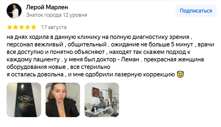 Клиника прекрасная с очень хорошими врачами хочется отметить доктора Леман диагностировала дистрофию сетчатки и сразу выполнили лазерную , хоть и не была готова к этому успокоила все время была в контакте , через час дискомыорт полностью прошел , сразу после было слезотечение и раздражение , в дальнейшем планирую делаю коррекцию и дополню отзыв , также все время присутствовал ген директор врач все время тоже рассказывал и морально настроил на процедуры , рекомендую