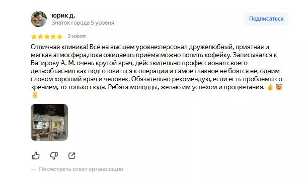 Отличная клиника! Всё на высшем уровне:персонал дружелюбный, приятная и мягкая атмосфера,пока ожидаешь приёма можно попить кофейку. Записывался к Багирову А. М. очень крутой врач, действительно профессионал своего дела:объяснил как подготовиться к операции и самое главное не боятся её, одним словом хороший врач и человек. Обязательно рекомендую, если есть проблемы со зрением, то только сюда. Ребята молодцы, желаю им успехом и процветания.