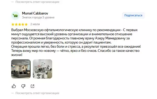 Выбрал Московскую офтальмологическую клинику по рекомендации - С первых минут ощущается высокий уровень организации и внимательное отношение персонала. Огромная благодарность главному врачу Азеру Мамедовичу за профессионализм и уверенность, которую он дарит пациентам.