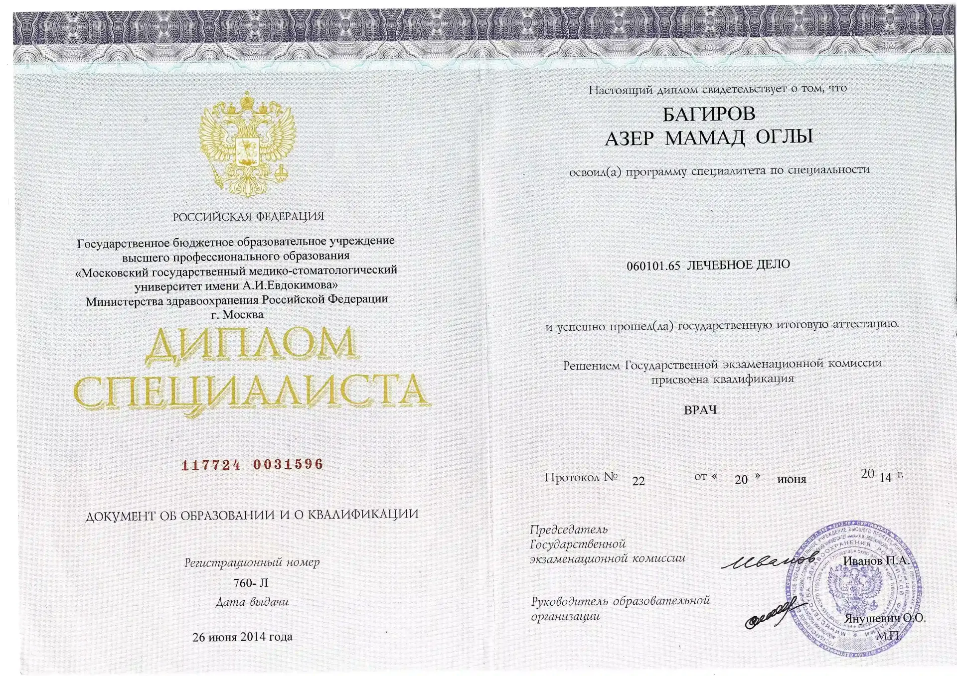 закончил ФГБУ ВО «Московский государственный медико-стоматологический университет имени А.И. Евдокимова».