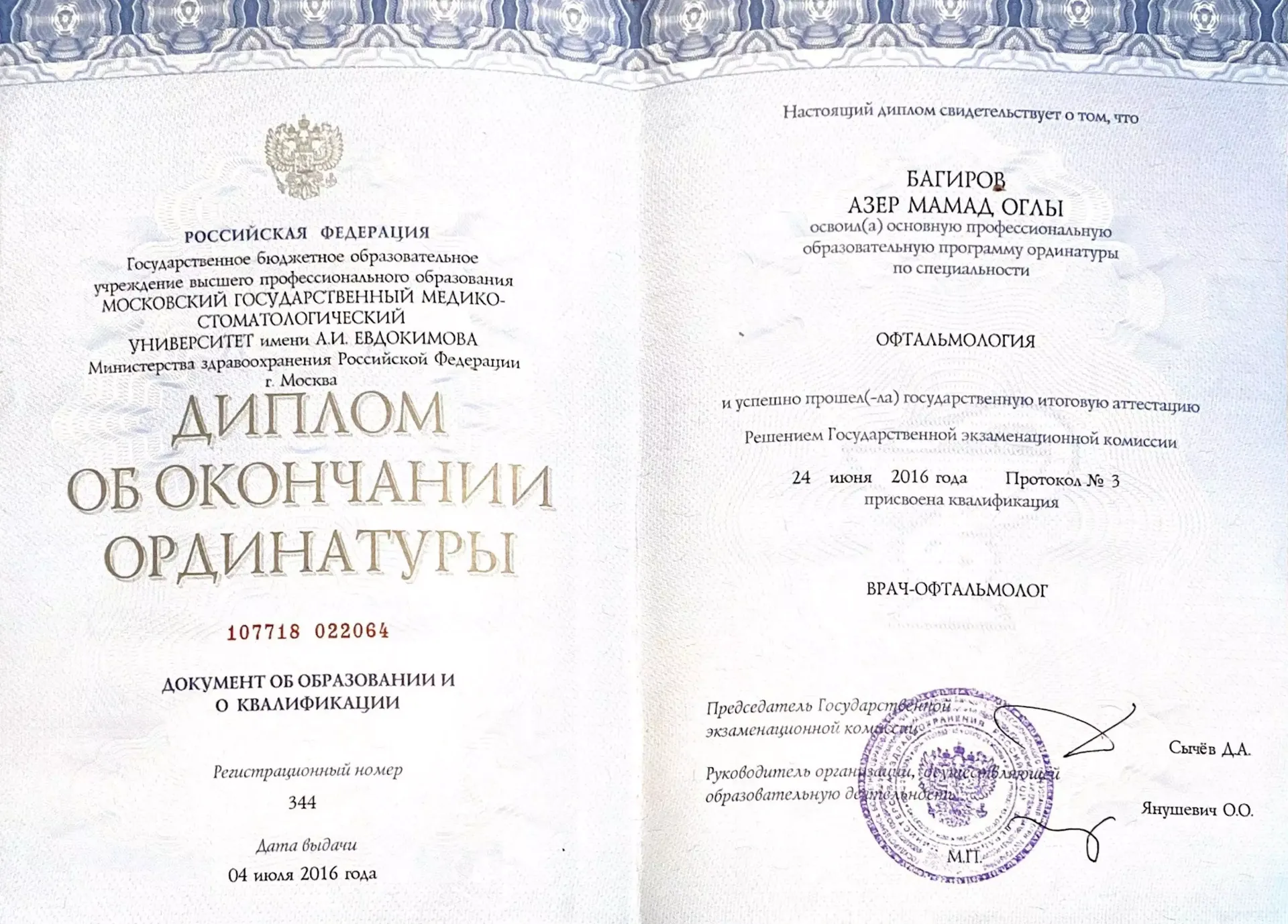 Закончил ординатуру МНТК "Микрохирургия глаза" им.академика С.Н.Фёдорова.