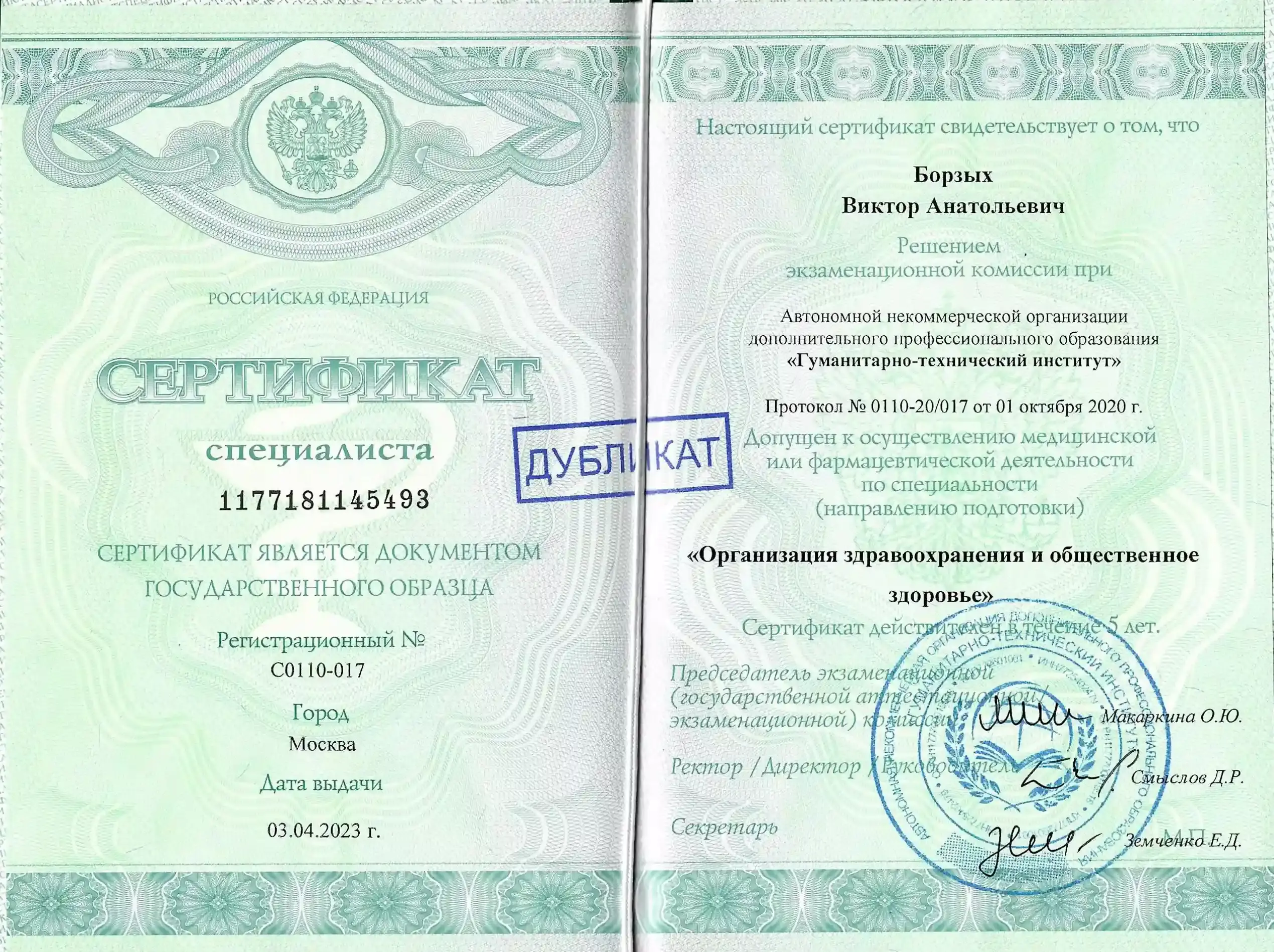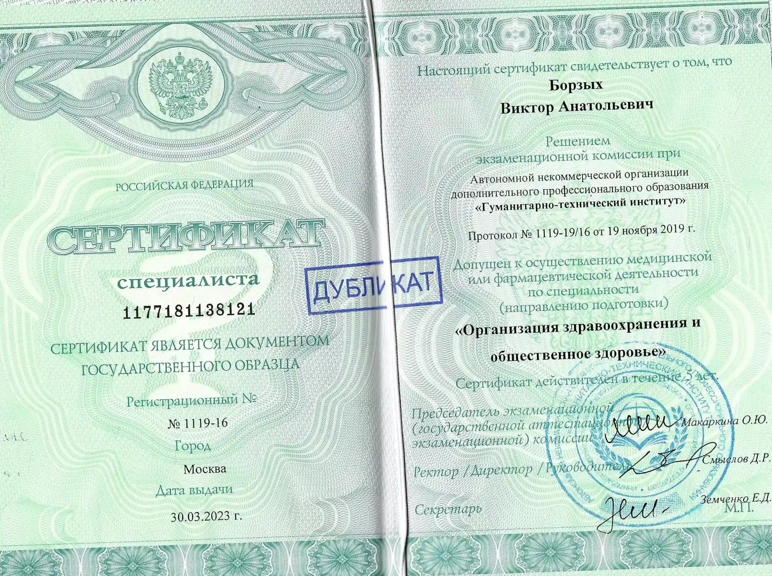 АНО ДПО "Гуманитарно-технический институт". Профессиональная переподготовка по специальности "Организация здравоохранения и общественное здоровье"
