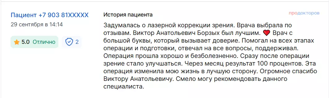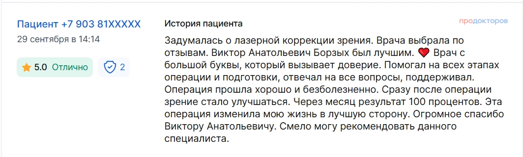 Задумалась о лазерной коррекции зрения. Врача выбрала по отзывам. Виктор Анатольевич Борзых был лучшим. Врач с большой буквы, который вызывает доверие. Помогал на всех этапах операции и подготовки, отвечал на все вопросы, поддерживал. Операция прошла хорошо и безболезненно. Сразу после операции зрение стало улучшаться. Через месяц результат 100 процентов. Эта операция изменила мою жизнь в лучшую сторону. Огромное спасибо Виктору Анатольевичу. Смело могу рекомендовать данного специалиста.