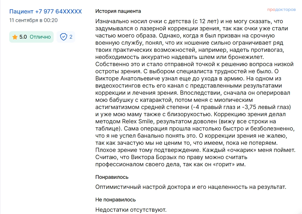 По рекомендации знакомых обратилась к Виктору Борзых для проведения лазерной коррекции зрения. Сама являюсь врачом и «работаю глазами», врача, кому доверить свое зрение, выбирала тщательно. Осталась довольна и первичной консультацией (подробно разобрали возможность вмешательства, проговорили все плюсы и минусы, выбрали метод, обсудили нюансы процедуры), и самой операцией (все прошло быстро, безболезненно, очень комфортно при поддержке врача), и периодом после (на контрольных обследованиях получала разъяснения и поддержку). Высоко оцениваю работу Виктора и как пациент, и как коллега. Рада, что выбрала именно его.