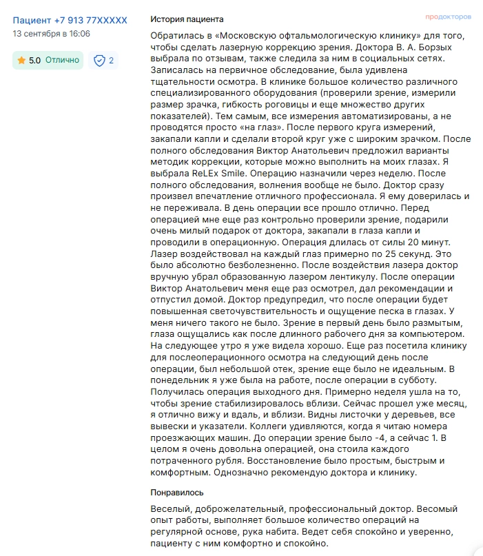 Обратилась в «Московскую офтальмологическую клинику» для того, чтобы сделать лазерную коррекцию зрения. Доктора В. А. Борзых выбрала по отзывам, также следила за ним в социальных сетях. Записалась на первичное обследование, была удивлена тщательности осмотра. В клинике большое количество различного специализированного оборудования (проверили зрение, измерили размер зрачка, гибкость роговицы и еще множество других показателей). Тем самым, все измерения автоматизированы, а не проводятся просто «на глаз». После первого круга измерений, закапали капли и сделали второй круг уже с широким зрачком. После полного обследования Виктор Анатольевич предложил варианты методик коррекции, которые можно выполнить на моих глазах. Я выбрала ReLEx Smile. Операцию назначили через неделю. После полного обследования, волнения вообще не было. Доктор сразу произвел впечатление отличного профессионала. Я ему доверилась и не переживала. В день операции все прошло отлично. Перед операцией мне еще раз контрольно проверили зрение, подарили очень милый подарок от доктора, закапали в глаза капли и проводили в операционную. Операция длилась от силы 20 минут. Лазер воздействовал на каждый глаз примерно по 25 секунд. Это было абсолютно безболезненно. После воздействия лазера доктор вручную убрал образованную лазером лентикулу. После операции Виктор Анатольевич меня еще раз осмотрел, дал рекомендации и отпустил домой. Доктор предупредил, что после операции будет повышенная светочувствительность и ощущение песка в глазах. У меня ничего такого не было. Зрение в первый день было размытым, глаза ощущались как после длинного рабочего дня за компьютером. На следующее утро я уже видела хорошо. Еще раз посетила клинику для послеоперационного осмотра на следующий день после операции, был небольшой отек, зрение еще было не идеальным. В понедельник я уже была на работе, после операции в субботу. Получилась операция выходного дня. Примерно неделя ушла на то, чтобы зрение стабилизировалось вблизи. Сейчас прошел уже месяц, я отлично вижу и вдаль, и вблизи. Видны листочки у деревьев, все вывески и указатели. Коллеги удивляются, когда я читаю номера проезжающих машин. До операции зрение было -4, а сейчас 1. В целом я очень довольна операцией, она стоила каждого потраченного рубля. Восстановление было простым, быстрым и комфортным. Однозначно рекомендую доктора и клинику.