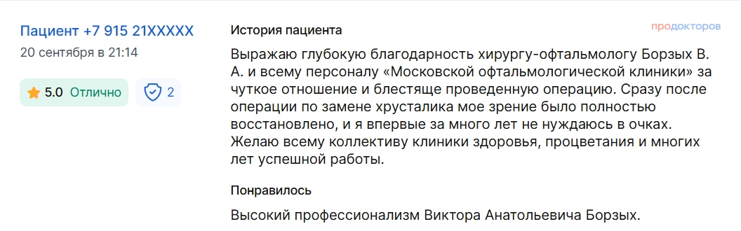 Выражаю глубокую благодарность хирургу-офтальмологу Борзых В. А. и всему персоналу «Московской офтальмологической клиники» за чуткое отношение и блестяще проведенную операцию. Сразу после операции по замене хрусталика мое зрение было полностью восстановлено, и я впервые за много лет не нуждаюсь в очках. Желаю всему коллективу клиники здоровья, процветания и многих лет успешной работы.