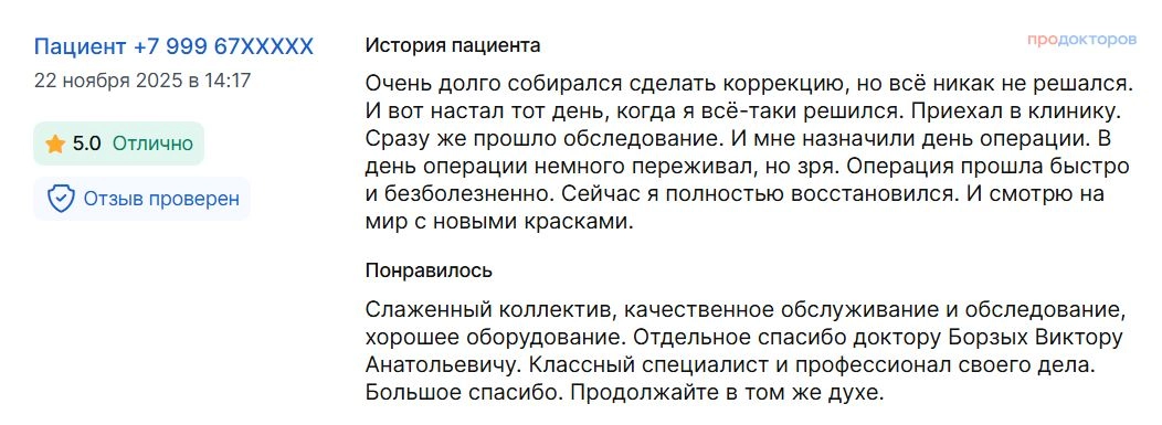 Хочу выразить огромную благодарность великолепному хирургу Борзых Виктору Анатольевичу за то, что я теперь могу видеть!