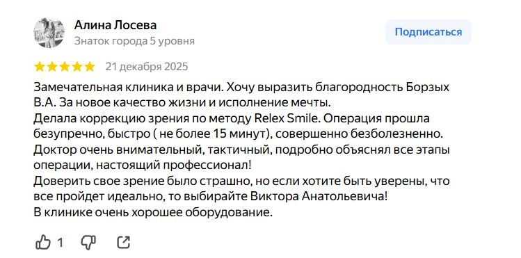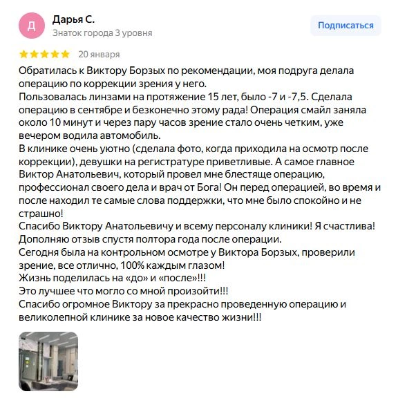 Хочется оставить отзыв о работе врача Борзых В. А. Приходила на обследование, в результате которого выяснилось, что мне можно делать лазерную коррекцию зрения. Долго не раздумывая, сразу же согласилась и через 2 недели назначили операцию. Врач посоветовал метод фемто ласик. В день операции меня ещё раз проверили и отправили в комнату переодеваться и ждать операцию. Выдали темные очки, вафлю и котика-антистресс. Честно признаюсь, что не волновалась, но немного переживала о том, что будут какие-то ощущения во время операции, но! Абсолютно ничего не чувствовала, все прошло под четким руководством врача и никакой боли не было. Единственный неприятный момент — это векорасширитель и то, это не такое чувство, от которого больно. Уже после операции я стала видеть лучше, чем когда заходила в операционную. Поехала домой, поспала и зрение стало ещё лучше. Первое время немного побаливали глаза, но это нормально. На следующий день проснулась и я вижу все! Абсолютно все! Глаза не болят, а зрение супер четкое! Я даже не знала, что люди могут так видеть просто так. Ехала в метро и разглядывала все вывески и указатели. Спасибо большое доктору Борзых В. А. за возможность видеть этот мир и за прекрасно проведенную операцию. всем рекомендую не сомневаться и выбирать лазерную коррекцию вместо ношения линз и очков. Отдельно хочу выделить атмосферу и душевность при работе с врачом и персоналом. Создается безумно комфортная обстановка, в которой все страхи и сомнения развеиваются. Врач профессионал своего дела, отвечает на все вопросы супер подробно. В клинике очень уютно и комфортно.