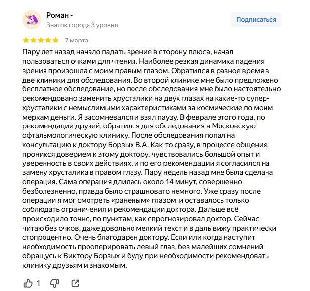 Пару лет назад начало падать зрение в сторону плюса, начал пользоваться очками для чтения. Наиболее резкая динамика падения зрения произошла с моим правым глазом. Обратился в разное время в две клиники для обследования. Во второй клинике мне было предложено бесплатное обследование, но после обследования мне было настоятельно рекомендовано заменить хрусталики на двух глазах на какие-то супер-хрусталики с немыслимыми характеристиками за космические по моим меркам деньги. Я засомневался и взял паузу. В феврале этого года, по рекомендации друзей, обратился для обследования в Московскую офтальмологическую клинику. После обследования попал на консультацию к доктору Борзых В.А. Как-то сразу, в процессе общения, проникся доверием к этому доктору, чувствовались большой опыт и уверенность в своих действиях, и по его рекомендации я согласился на замену хрусталика в правом глазу. Пару недель назад мне была сделана операция. Сама операция длилась около 14 минут, совершенно безболезненно, правда было страшновато немного. Уже сразу после операции я мог смотреть «раненым» глазом, и оставалось только соблюдать ограничения и рекомендации доктора. Дальше всё происходило точно, по пунктам, как спрогнозировал доктор. Сейчас читаю без очков, даже довольно мелкий текст и в даль вижу практически стопроцентно. Очень благодарен доктору. Если или когда наступит необходимость прооперировать левый глаз, без малейших сомнений обращусь к Виктору Борзых и буду при необходимости рекомендовать клинику друзьям и знакомым.