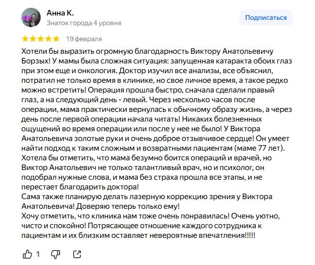 Хотели бы выразить огромную благодарность Виктору Анатольевичу Борзых! У мамы была сложная ситуация: запущенная катаракта обоих глаз при этом еще и онкология. Доктор изучил все анализы, все объяснил, потратил не только время в клинике, но свое личное время, а такое редко можно встретить! Операция прошла быстро, сначала сделали правый глаз, а на следующий день - левый. Через несколько часов после операции, мама практически вернулась к обычному образу жизнь, а через день после первой операции начала читать! Никаких болезненных ощущений во время операции или после у нее не было! У Виктора Анатольевича золотые руки и очень доброе отзывчивое сердце! Он умеет найти подход к таким сложным и возвратными пациентам (маме 77 лет).