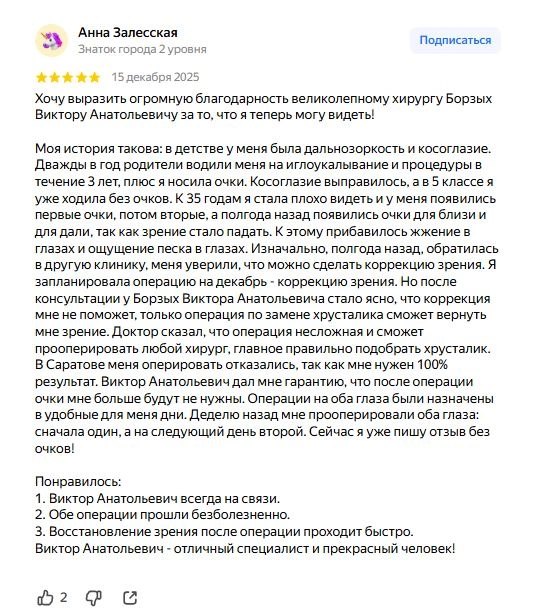 Моя история такова: в детстве у меня была дальнозоркость и косоглазие. Дважды в год родители водили меня на иглоукалывание и процедуры в течение 3 лет, плюс я носила очки. Косоглазие выправилось, а в 5 классе я уже ходила без очков. К 35 годам я стала плохо видеть и у меня появились первые очки, потом вторые, а полгода назад появились очки для близи и для дали, так как зрение стало падать. К этому прибавилось жжение в глазах и ощущение песка в глазах. Изначально, полгода назад, обратилась в другую клинику, меня уверили, что можно сделать коррекцию зрения. Я запланировала операцию на декабрь - коррекцию зрения. Но после консультации у Борзых Виктора Анатольевича стало ясно, что коррекция мне не поможет, только операция по замене хрусталика сможет вернуть мне зрение. Доктор сказал, что операция несложная и сможет прооперировать любой хирург, главное правильно подобрать хрусталик. В Саратове меня оперировать отказались, так как мне нужен 100% результат. Виктор Анатольевич дал мне гарантию, что после операции очки мне больше будут не нужны. Операции на оба глаза были назначены в удобные для меня дни. Деделю назад мне прооперировали оба глаза: сначала один, а на следующий день второй. Сейчас я уже пишу отзыв без очков!