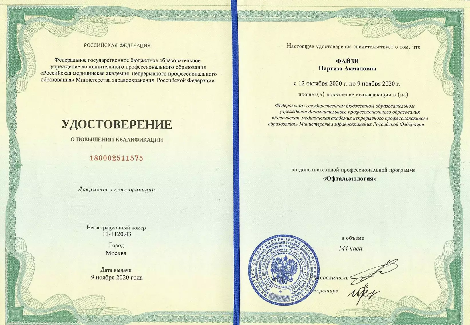 Окончила клиническую ординатуру по специальности “офтальмология” на базе МНТК “Микрохирургия глаза”
