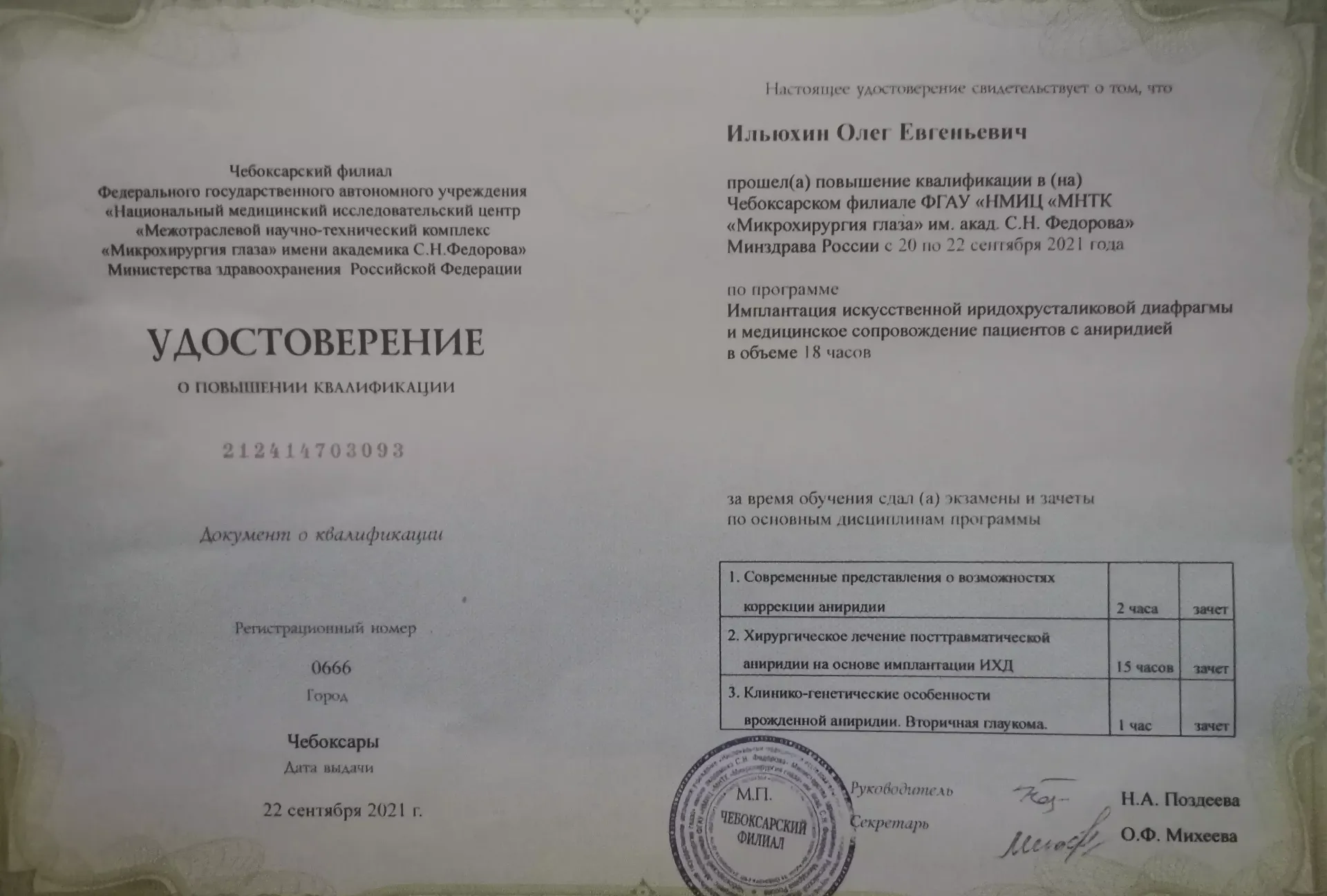 Неоднократно проходил специализации по различным разделам офтальмологии в ведущих офтальмологических центрах Российской Федерации (ежегодно), Индии 2011, Австрии 2012, Франции 2013, США 2014 и 2016.