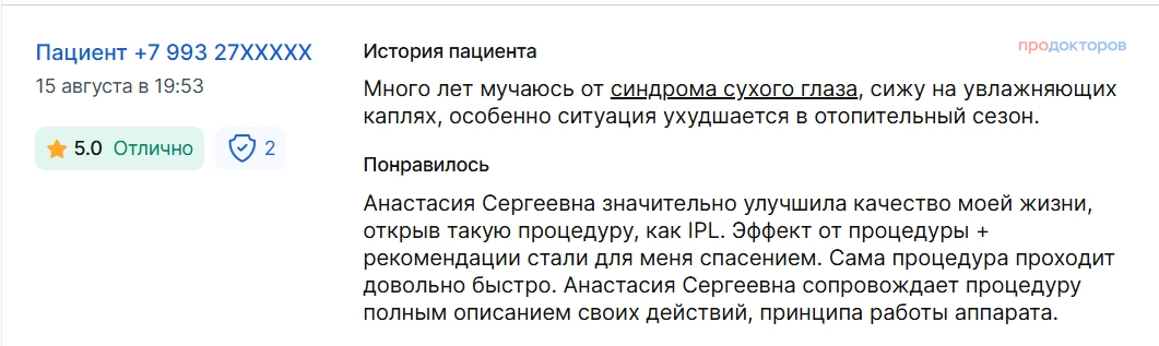 Понравилось: Анастасия Сергеевна значительно улучшила качество моей жизни, открыв такую процедуру, как IPL. Эффект от процедуры + рекомендации стали для меня спасением. Сама процедура проходит довольно быстро. Анастасия Сергеевна сопровождает процедуру полным описанием своих действий, принципа работы аппарата.
