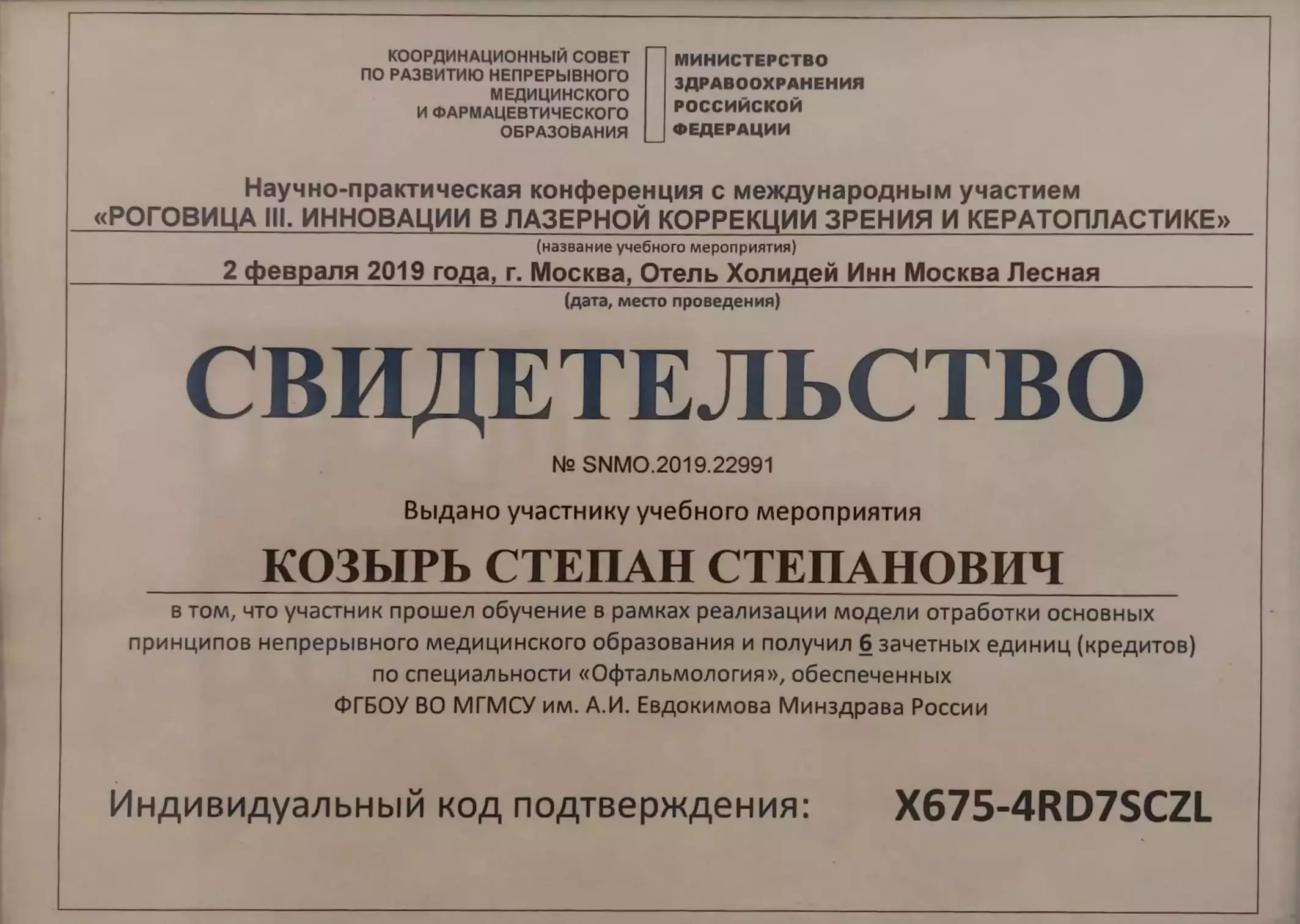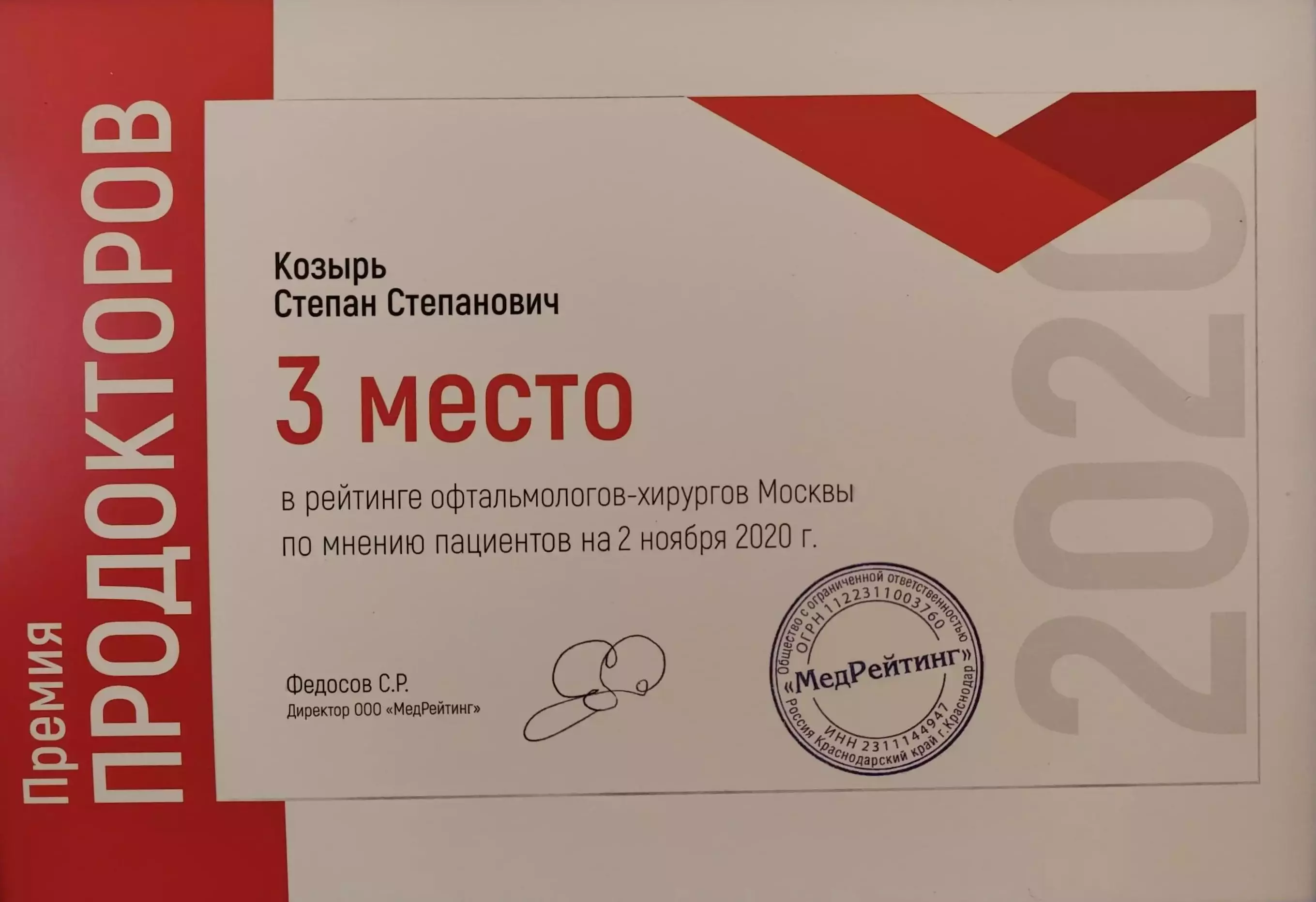 В работе Козырь Степана Степановича все понравилось. Думаю, если бы все врачи были такими, как он, то весь мир был бы здоров! Пациентом была моя мама, мы обращались с катарактой. Кроме того, ранее другой специалист менял хрусталик, и Степан Степанович исправлял его ошибку, было сделано зашивание сетчатки. На мой взгляд, посещение длилось недолго, но специалист был очень внимателен. После визита уже есть результат! В разговоре врач не называл сложные медицинские термины, все рассказывал доступно и просто, вопросов в результате у нас не осталось. Считаю, что данного специалиста нужно рекомендовать другим пациентам!