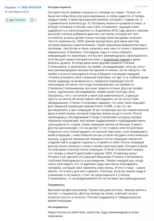 Сегодня после приёма я вышла со слезами на глазах. Только это были не слёзы боли или разочарования, а слёзы радости. А теперь предыстория. У меня врожденная миопия, которая с годами из -2 стремительно взлетела до -9. Половину жизни я провела в очках, а вторую половину в линзах, как и все «очкарики», ощущая свою ущербность и неполноценность. В далёком 2012 году врачи к миопии высокой степени добавили диагноз «сетчатка, которая вот-вот отслоится, рожать детей только посредством кесарева сечения». Честно признаться, 100% зрение всегда было для меня мечтой, которая казалась невыполнимой. Такие серьезные вмешательства в организм, тем более в глаза, казались мне чем-то очень страшным и нереальным. Я боялась. Последние годы я стала собирать информацию по знакомым, кто бы мог рекомендовать офтальмолога хотя бы для грамотной диагностики, о коррекции зрения я даже боялась думать. И когда двое моих друзей назвали Степана Степановича, я записалась на приём, не раздумывая, хотя до этого мне рекомендовали множество врачей и клиник, но не «ёкнуло». На приём я шла на трясущихся ногах и бешено стучащим сердцем, готовая услышать свой страшный приговор, но где-то в глубине души лелея надежду на возможность лазерной коррекции после коагуляции сетчатки. Но когда познакомилась на приёме со Степаном Степановичем, все мои тревоги отпали. Доктор провёл очень тщательное обследование, приём занял полтора часа. Оказалось, что с сетчаткой у меня всё замечательно, а раньше просто не могли её качественно обследовать из-за отсутствия оборудования. Степан Степанович заверил, что мои глаза подходят для лазерной коррекции зрения Femto LASIK, и мы тут же договорились о дне операции. И вот позавчера настал самый важный день в моей жизни, который поделил жизнь на до и после. После необходимых обследований Степан Степанович успешно провел лазерную коррекцию, всё время поддерживая и подбадривая меня, трясущуюся от страха. Сама операция заняла не больше 5 минут. Доктор рассказывал, что он делает и что я увижу или почувствую. Отдельно хочу поблагодарить остальной персонал, участвовавший в моей операции: с анестезиологом мы успели обсудить классическую музыку, а другая прекрасная женщина после операции принесла сладкий чай и усадила отдохнуть и прийти в себя. После операции доктор лично написал и узнал о моем самочувствии. Сегодня я была на плановом осмотре после операции. Степан Степанович сказал, что теперь у меня 0 диоптрий и зрение 120%. Я наконец вижу! Почему я не сделала это раньше? Выражаю Степану Степановичу глубокую благодарность и восхищение. Теперь каждый раз, когда смогу разглядеть что-то вдалеке, буду мысленно благодарить человека, который смог изменить мою жизнь. И этот отзыв - самое малое, что я могу для него сделать. Поэтому, если вы зашли сюда в сомнениях и не знаете, стоит ли записываться к Степану Степановичу, то не раздумывайте! Он не оставит вас равнодушным.