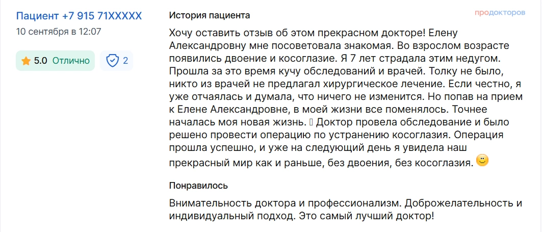 Хочу оставить отзыв об этом прекрасном докторе! Елену Александровну мне посоветовала знакомая. Во взрослом возрасте появились двоение и косоглазие. Я 7 лет страдала этим недугом. Прошла за это время кучу обследований и врачей. Толку не было, никто из врачей не предлагал хирургическое лечение. Если честно, я уже отчаялась и думала, что ничего не изменится. Но попав на прием к Елене Александровне, в моей жизни все поменялось. Точнее началась моя новая жизнь. Доктор провела обследование и было решено провести операцию по устранению косоглазия. Операция прошла успешно, и уже на следующий день я увидела наш прекрасный мир как и раньше, без двоения, без косоглазия. :)