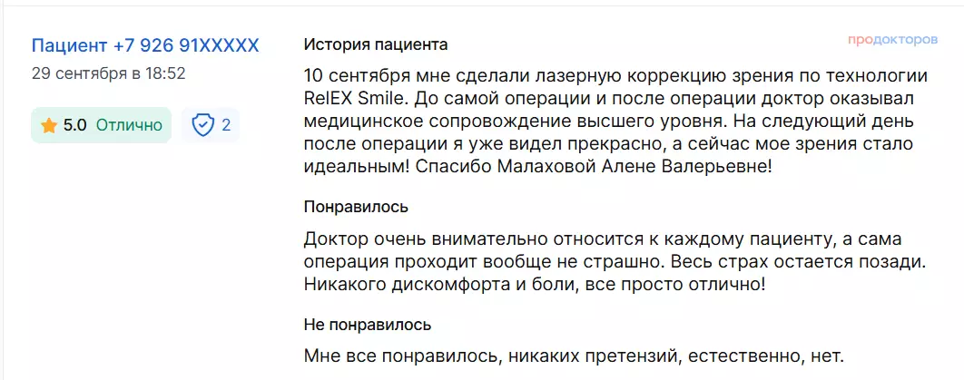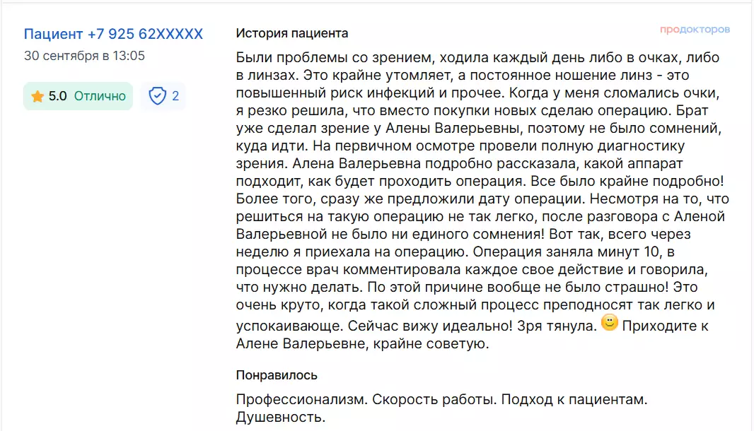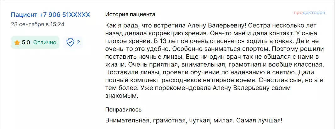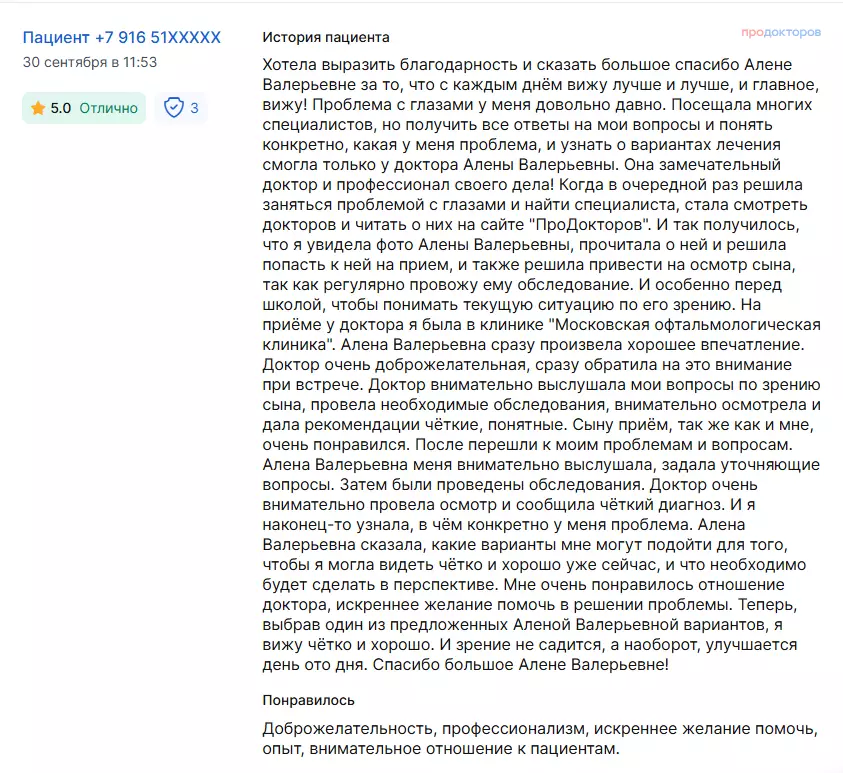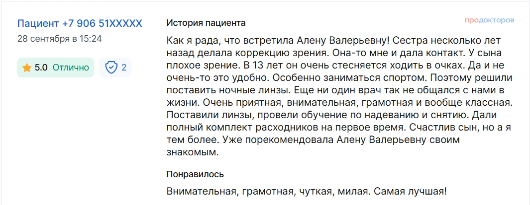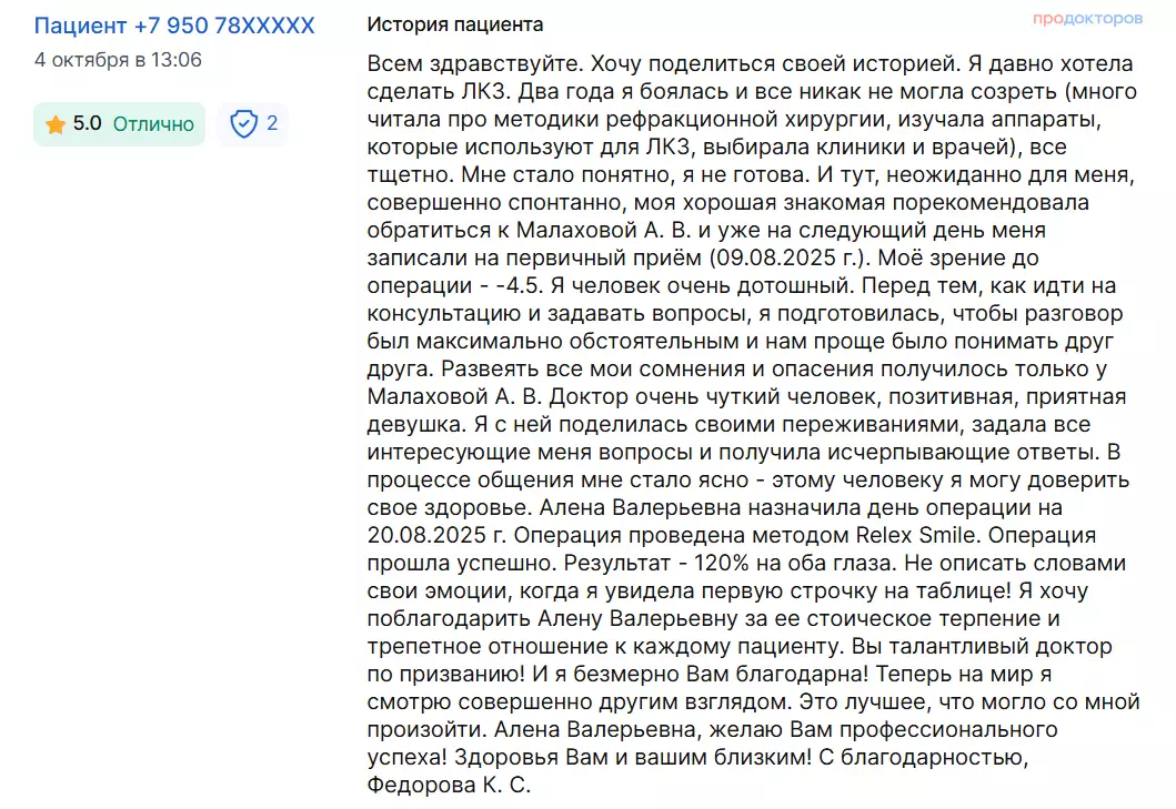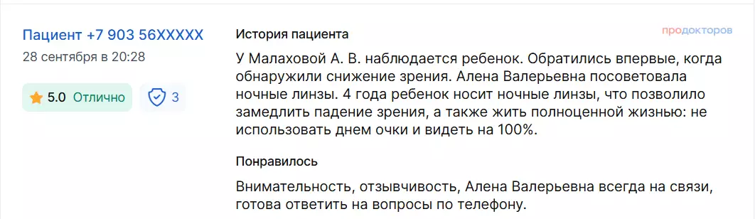Были неоднократно на приеме с дочерью у Малаховой Алены Валерьевны. Алена Валерьевна нам понравилась с первых минут как доктор - подход к пациенту на высшем уровне, даже если это ребенок! Мы с мужем находились при диагностики зрения нашей дочери. При том, что в нашем случае за год снизилось сильно зрение, Алена Валерьевна помогла нам остановить дальнейшее ухудшение и добиться хорошего результата. Нам (родителям) все подробно рассказала, показала, что происходит со зрением дочери. Дочку, по подборе жестких линз всему научила, Алена Валерьевна никуда не торопилась, все делала основательно, так что выйдя из клиники, наш стресс и паника сменились на благодарность! Врач невероятно профессионально относится к своим пациентам, видно, как Алена Валерьевна любит помогать людям восстанавливать зрение. Я сама давно задумывалась о лазерной коррекции зрения, но смотря на результаты работы Алены Валерьевны, мои сомнения равнялись, и я точно решила сделать лазерную коррекцию.