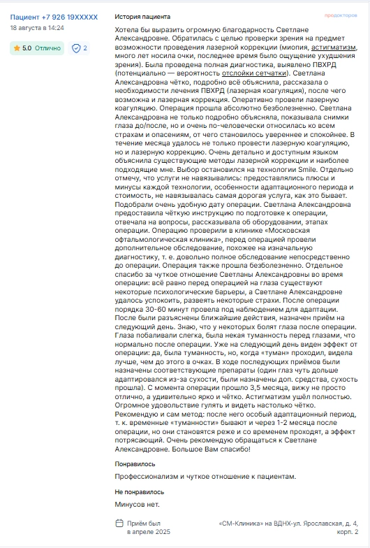 Хотела бы выразить огромную благодарность Светлане Александровне. Обратилась с целью проверки зрения на предмет возможности проведения лазерной коррекции (миопия, астигматизм, много лет носила очки, последнее время было ощущение ухудшения зрения). Была проведена полная диагностика, выявлено ПВХРД (потенциально — вероятность отслойки сетчатки). Светлана Александровна чётко, подробно всё объяснила, рассказала о необходимости лечения ПВХРД (лазерная коагуляция), после чего возможна и лазерная коррекция. Оперативно провели лазерную коагуляцию. Операция прошла абсолютно безболезненно. Светлана Александровна не только подробно объясняла, показывала снимки глаза до/после, но и очень по-человечески относилась ко всем страхам и опасениям, от чего становилось увереннее и спокойнее. В течение месяца удалось не только провести лазерную коагуляцию, но и лазерную коррекцию. Очень детально и доступным языком объяснила существующие методы лазерной коррекции и наиболее подходящие мне. Выбор остановился на технологии Smile. Отдельно отмечу, что услуги не навязывались: предоставлялись плюсы и минусы каждой технологии, особенности адаптационного периода и стоимость, не навязывалась самая дорогая услуга, как это бывает. Подобрали очень удобную дату операции. Светлана Александровна предоставила чёткую инструкцию по подготовке к операции, отвечала на вопросы, рассказывала об оборудовании, этапах операции. Операцию проверили в клинике «Московская офтальмологическая клиника», перед операцией провели дополнительное обследование, похожее на изначальную диагностику, т. е. довольно полное обследование непосредственно до операции. Операция также прошла безболезненно. Отдельное спасибо за чуткое отношение Светланы Александровны во время операции: всё равно перед операцией на глаза существуют некоторые психологические барьеры, а Светлане Александровне удалось успокоить, развеять некоторые страхи. После операции порядка 30-60 минут провела под наблюдением для адаптации. После были разъяснены ближайшие действия, назначен приём на следующий день. Знаю, что у некоторых болят глаза после операции. Глаза побаливали слегка, была некая туманность перед глазами, что нормально после операции. Уже на следующий день виден эффект от операции: да, была туманность, но, когда «туман» проходил, видела лучше, чем до этого в очках. В ходе последующих приёмов были назначены соответствующие препараты (один глаз чуть дольше адаптировался из-за сухости, были назначены доп. средства, сухость прошла). С момента операции прошло 3,5 месяца, вижу не просто отлично, а удивительно ярко и чётко. Астигматизм ушёл полностью. Огромное удовольствие гулять и видеть настолько чётко. Рекомендую и сам метод: после него особый адаптационный период, т. к. временные «туманности» бывают и через 1-2 месяца после операции, но они становятся реже и со временем проходят, а эффект потрясающий. Очень рекомендую обращаться к Светлане Александровне. Большое Вам спасибо!