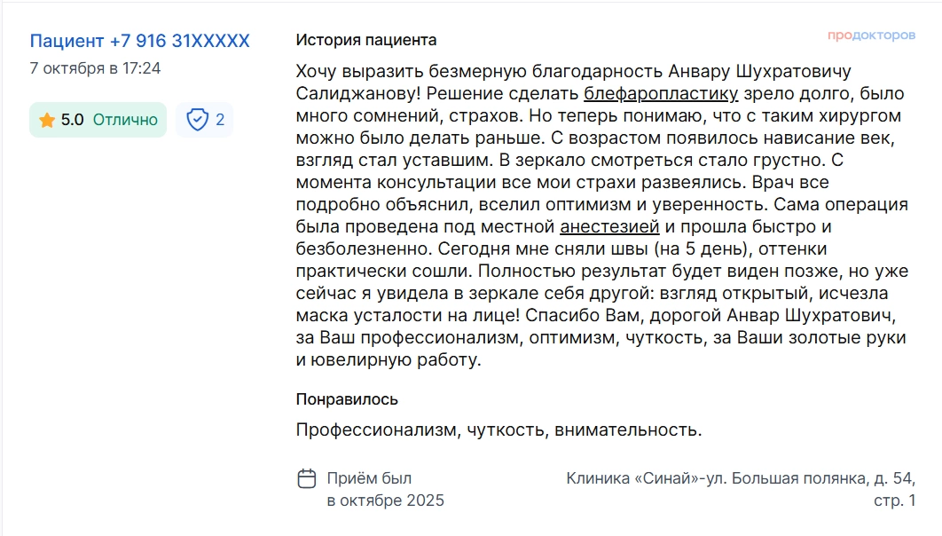 Хочу выразить безмерную благодарность Анвару Шухратовичу Салиджанову! Решение сделать блефаропластику зрело долго, было много сомнений, страхов. Но теперь понимаю, что с таким хирургом можно было делать раньше. С возрастом появилось нависание век, взгляд стал уставшим. В зеркало смотреться стало грустно. С момента консультации все мои страхи развеялись. Врач все подробно объяснил, вселил оптимизм и уверенность. Сама операция была проведена под местной анестезией и прошла быстро и безболезненно. Сегодня мне сняли швы (на 5 день), оттенки практически сошли. Полностью результат будет виден позже, но уже сейчас я увидела в зеркале себя другой: взгляд открытый, исчезла маска усталости на лице! Спасибо Вам, дорогой Анвар Шухратович, за Ваш профессионализм, оптимизм, чуткость, за Ваши золотые руки и ювелирную работу.