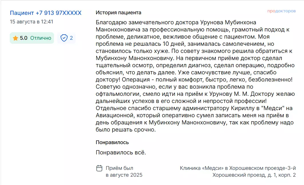 Благодарю замечательного доктора Урунова Мубинхона Манонхоновича за профессиональную помощь, грамотный подход к проблеме, деликатное, вежливое общение с пациентом. Моя проблема не решалась 10 дней, занималась самолечением, но становилось только хуже. По совету знакомого решила обратиться к Мубинхону Манонхоновичу. На первичном приёме доктор сделал тщательный осмотр, определил диагноз, сделал операцию, подробно объяснил, что делать далее. Уже самочувствие лучше, спасибо доктору! Операция - полный комфорт, быстро, легко, безболезненно! Советую однозначно, если у вас возникла проблема по офтальмологии, смело идти на приём к Урунову М. М. Доктору желаю дальнейших успехов в его сложной и непростой профессии! Отдельное спасибо старшему администратору Кириллу в "Медси" на Авиационной, который оперативно сумел записать меня на приём в день обращения к Мубинхону Манонхоновичу, так как проблему надо было решать срочно.