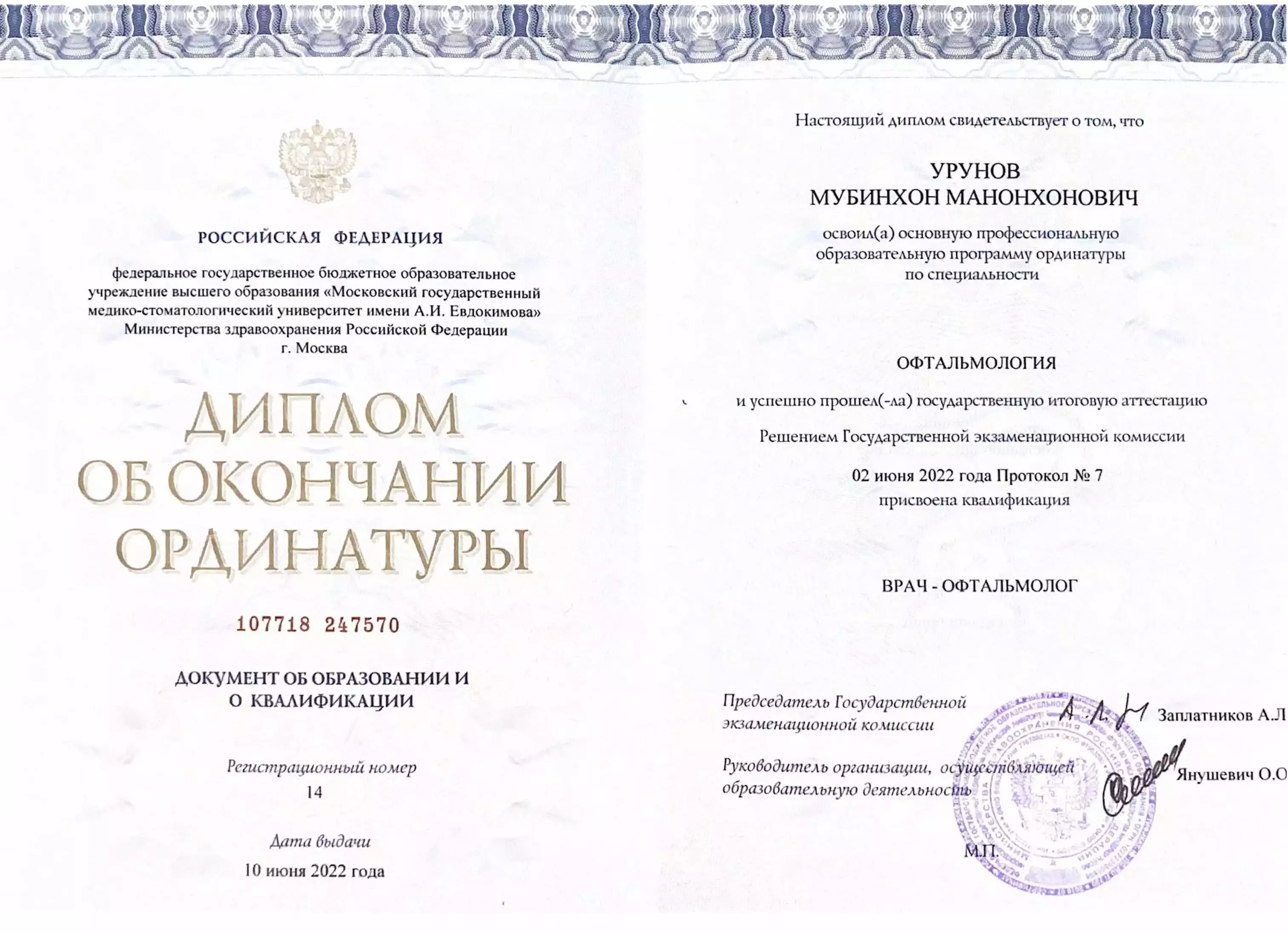 закончил ординатуру ФГБУ ВО «Московский государственный медико-стоматологический университет имени А.И. Евдокимова». На базе МНТК «Микрохирургия глаза» им. академика С.Н. Федорова