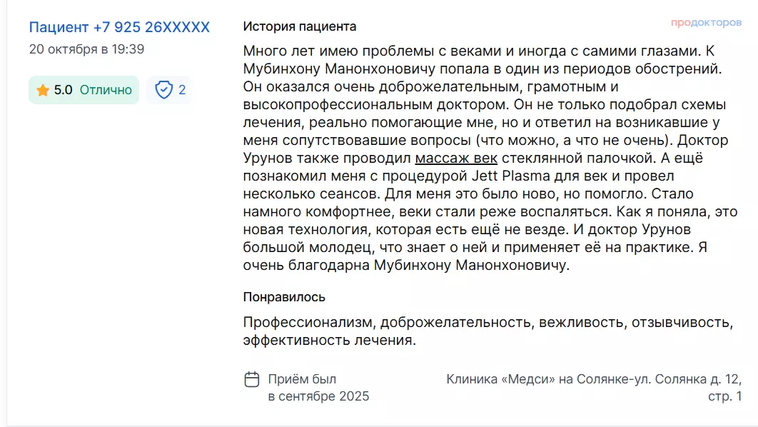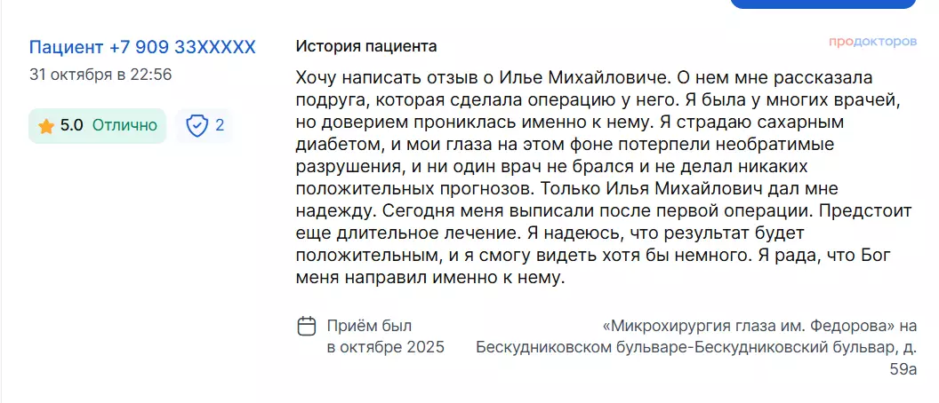 У нас превосходная репутация, лучшие врачи-офтальмологи Москвы, разумная цена на услуги, достоверная диагностика и эффективное лечение.