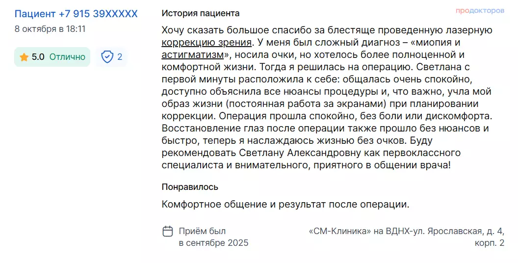 Были неоднократно на приеме с дочерью у Малаховой Алены Валерьевны. Алена Валерьевна нам понравилась с первых минут как доктор - подход к пациенту на высшем уровне, даже если это ребенок! Мы с мужем находились при диагностики зрения нашей дочери. При том, что в нашем случае за год снизилось сильно зрение, Алена Валерьевна помогла нам остановить дальнейшее ухудшение и добиться хорошего результата. Нам (родителям) все подробно рассказала, показала, что происходит со зрением дочери. Дочку, по подборе жестких линз всему научила, Алена Валерьевна никуда не торопилась, все делала основательно, так что выйдя из клиники, наш стресс и паника сменились на благодарность! Врач невероятно профессионально относится к своим пациентам, видно, как Алена Валерьевна любит помогать людям восстанавливать зрение. Я сама давно задумывалась о лазерной коррекции зрения, но смотря на результаты работы Алены Валерьевны, мои сомнения равнялись, и я точно решила сделать лазерную коррекцию.