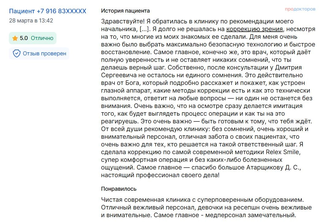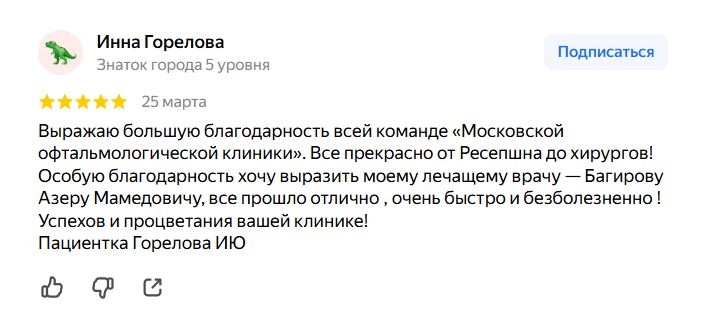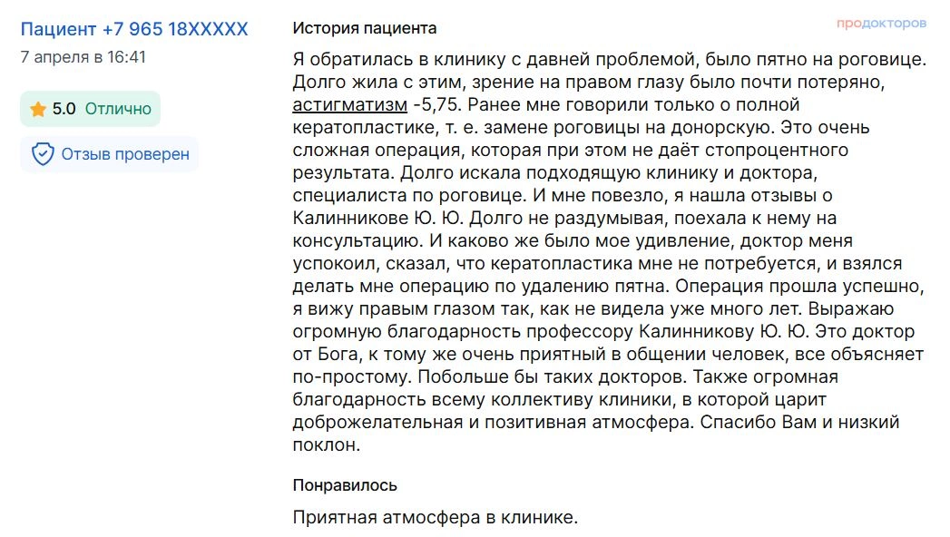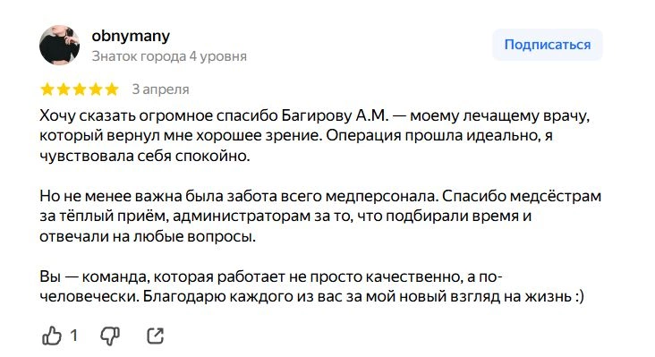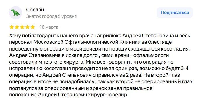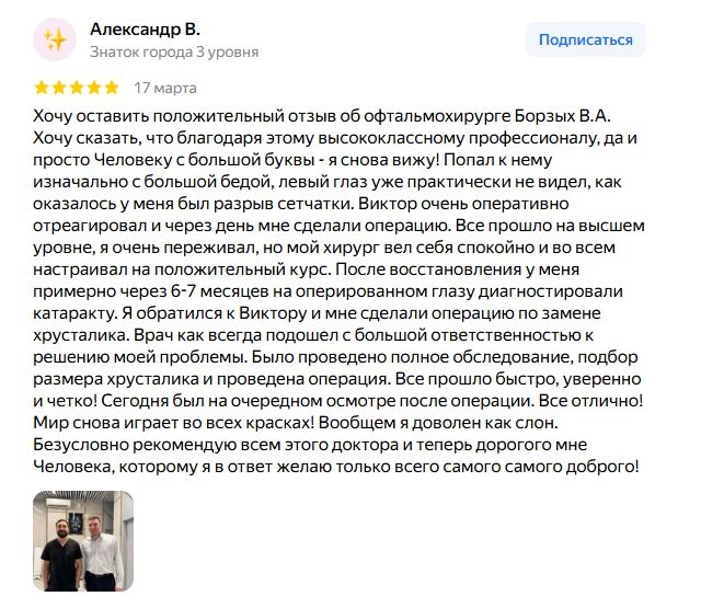 Записались на диагностику, по результатам которой узнали, что врач Борзых Виктор Анатольевич возьмется за операцию. Оперировали в два этапа: сначала глаз, который видел, через несколько дней тот, который совсем ослеп. Уже на следующий день после операции оба глаза видели на 100%!